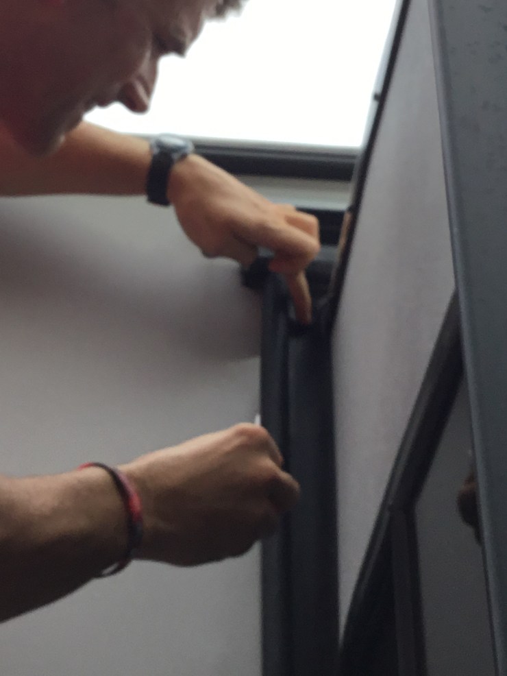 Nos percatamos que lo único que aguantaba el sello de bombilla era un tornillo en una de las esquinas de la parte superior de la puerta corrediza. Una vez removido el tornillo, el sello se salió de la canal. Es sensato pensar que este método de instalación de sello puede fallar en cualquier momento.