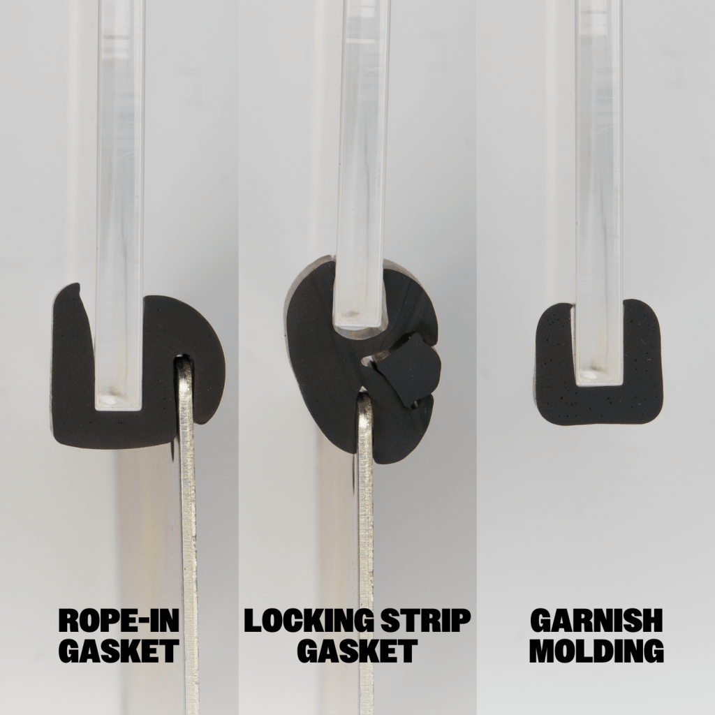- Locking strip gaskets feature a separate strip that secures the glass.