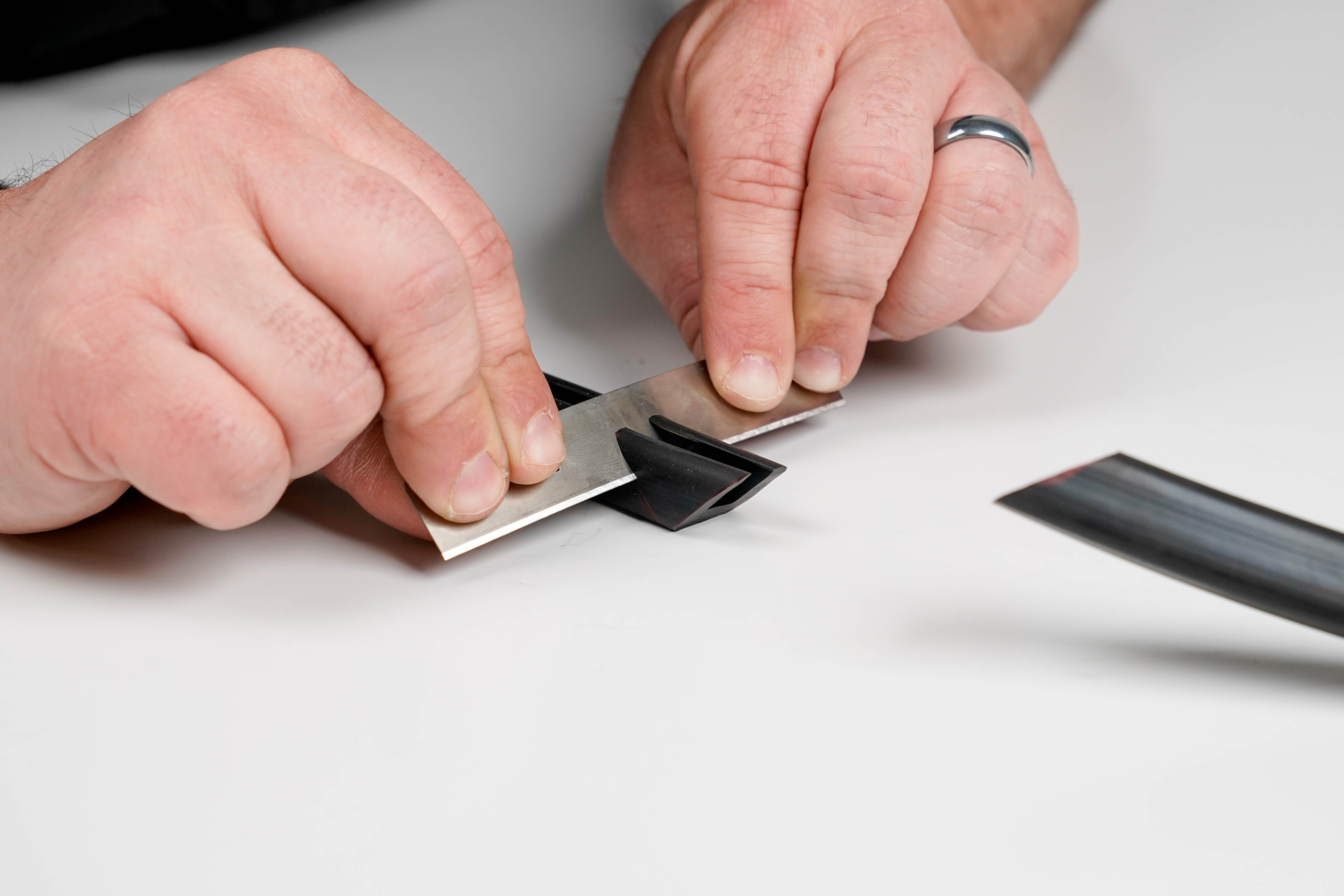 A sharp razor blade should be used with minimal pressure to prevent rubber deformation. This technique applies to both flat end-to-end butt joints and mitered corners. Properly aligning and securing the material before cutting helps maintain accuracy.